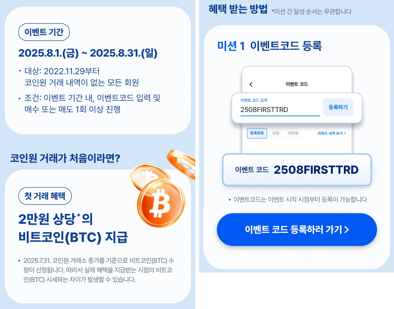 첫 거래 미션 진행할 때 꼭 이벤트코드를 등록하고 진행해야 혜택을 받을 수 있어요