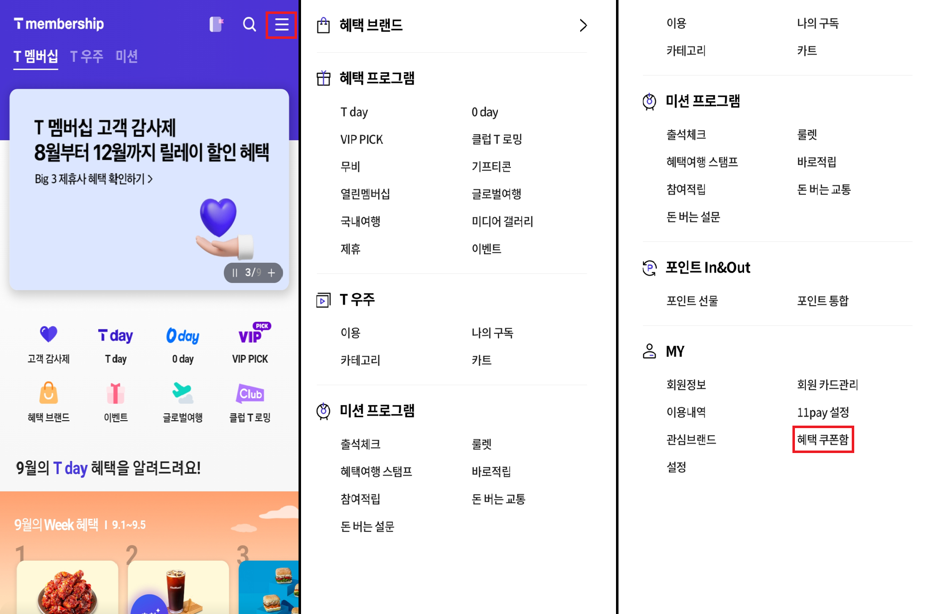 1. 티멤버십 메인화면 우측 상단에 있는 버튼을 누릅니다